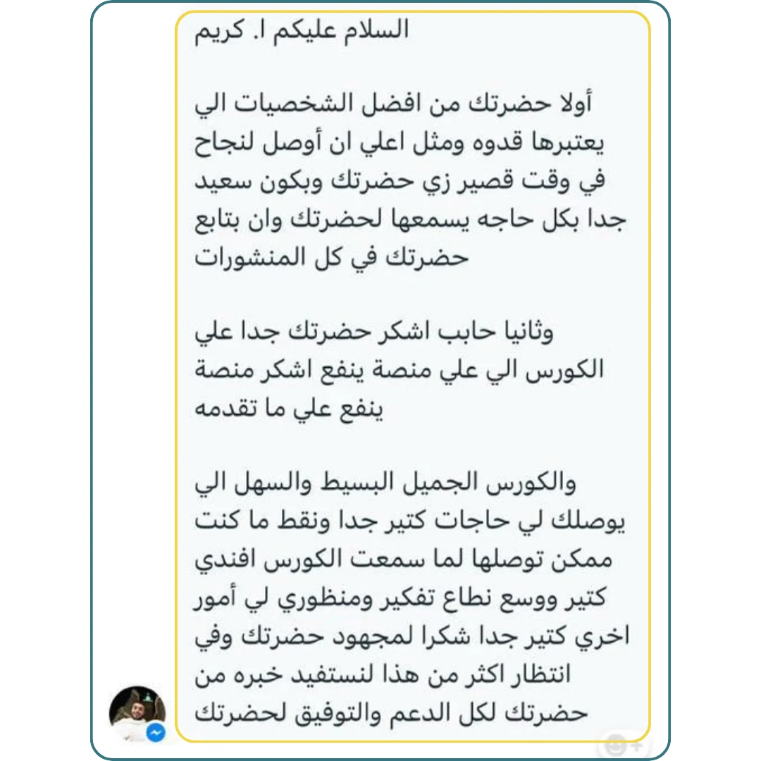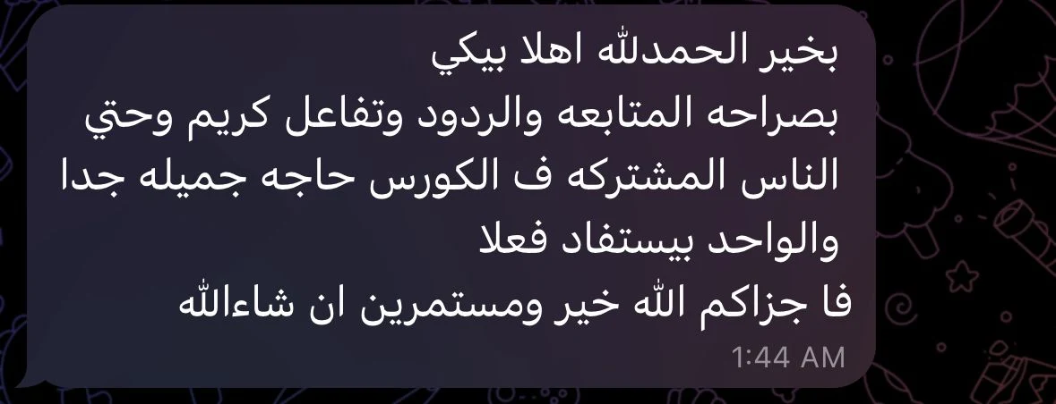 هتدخل جروب خاص بالمشتركين، كله ناس زيك عندهم نفس الهدف والطموح. تقدر تسأل، تتفاعل، تشارك نتائجك، وتاخد Feedback مباشر من كريم وفريقه عشان تفضل دايمًا متقدم خطوة.