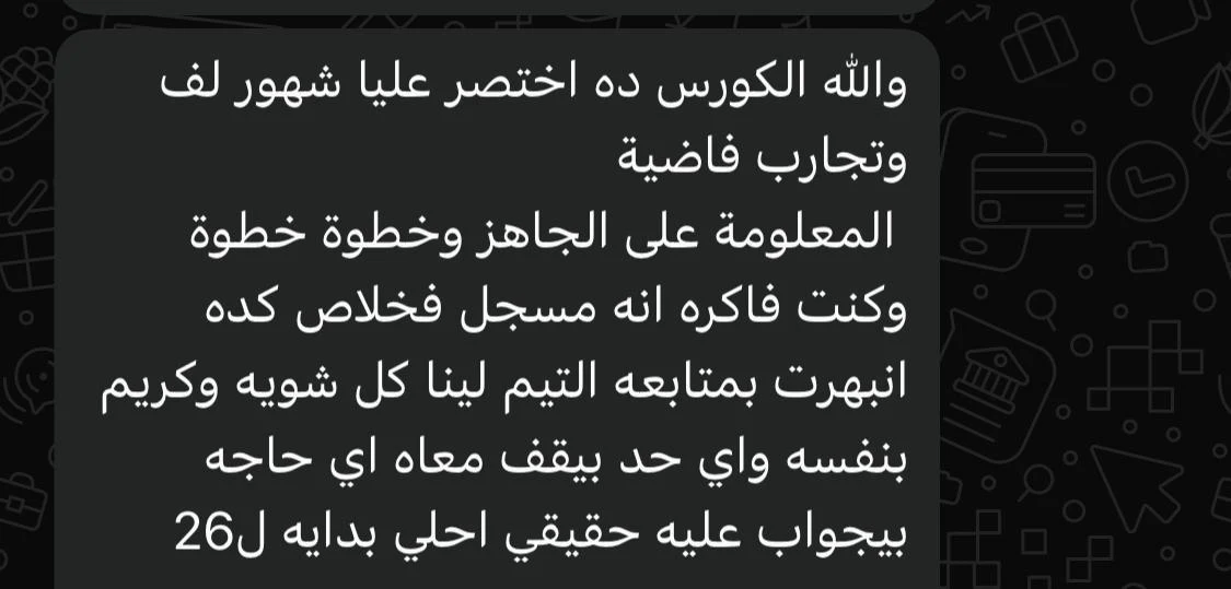 والله العظيم كمية المعلومات اللي شوفتها في الكورس دي اتعلمتها في 8 سنين ميديا. الكورس مبني على نتائج حقيقية وناس بتعمل أرقام فعلًا. قوي جدًا، مختلف عن أي حاجة في الوطن العربي، وهيأثر على طريقك ويخليك تعمل فلوس أسرع بكتير.